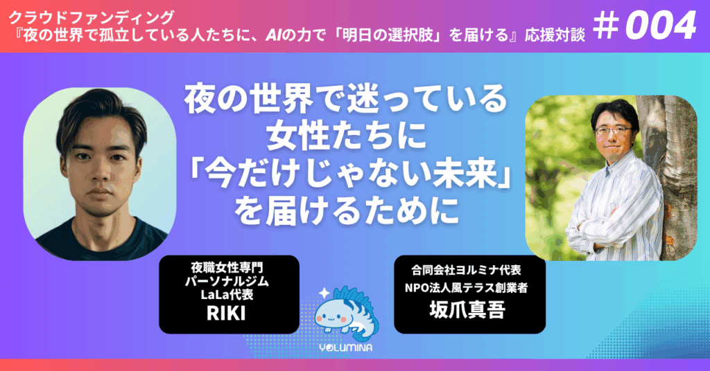現在挑戦中のクラウドファンディング『夜の世界で孤立している人たちに、AIの力で「明日の選択肢」を届ける』(2025年10月20日~12月19日まで)の応援対談、第4回目は、『夜の世界で迷っている女性たちに「今だけじゃない未来」を届けるために』というテーマで、夜職女性専門パーソナルジムLaLa 代表のRIKIさんにお話を伺います!