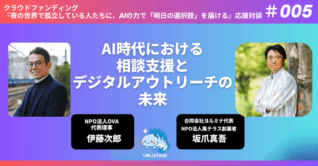 現在挑戦中のクラウドファンディング『夜の世界で孤立している人たちに、AIの力で「明日の選択肢」を届ける』(2025年10月20日~12月19日まで)の応援対談、第5回目は、「AI時代における相談支援とデジタルアウトリーチの未来」というテーマで、NPO法人OVA代表理事の伊藤次郎さんにお話を伺いました!
