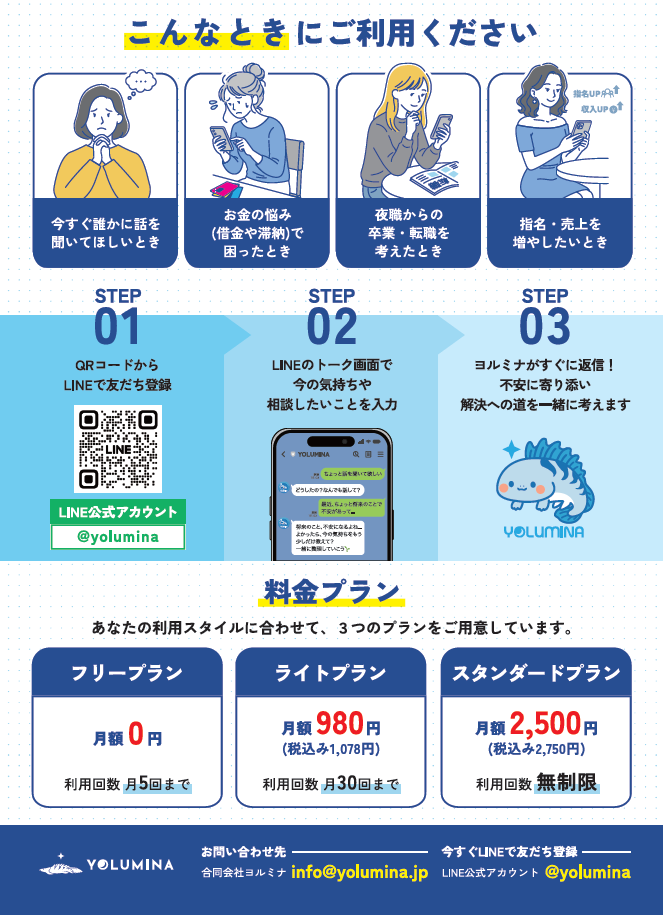 全国の夜職関係者の皆様、フリープランも用意しておりますので、LINEで友だち登録して、ガンガン使い倒して頂けると嬉しいです🙌